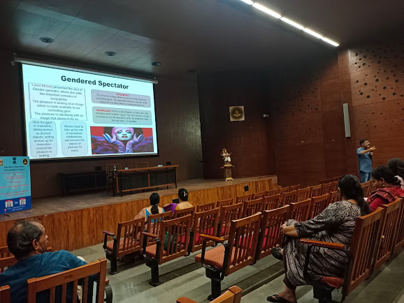 Fourth session was on "Celluloid Dreams: Cinema" delivered by Dr. J.A.H. Khatri sir, assistant professor at School of Liberal Studies & Education at Navrachana University, Vadodara. Sir profoundly talked about cinematic reading and theories such as Auteur theory and Genere theory and how these two very important theoretical standpoints are important to read cinema. Sir discussed about Indian Cinema and reading about, Creating Her, The Heroine: The Comforter, and Identifying Villian. signifier in cinema is always 'imagining' that has no real-world connection. Sir also expounds on Cinema Spectatorship - as Christian Metz identified three processes: Identification, Voyeurism, and Fetishism. Second about Gendered Spectator was presented by Laura Mulvey- Scopophilia and Identification.